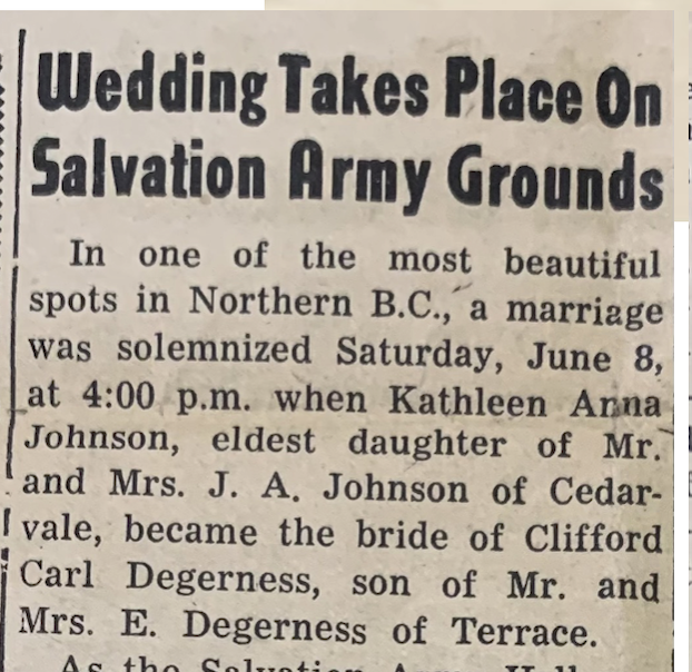 This newspaper article about the wedding, believed to be from the Terrace Daily Herald, was found in family papers and also confirms her parents.