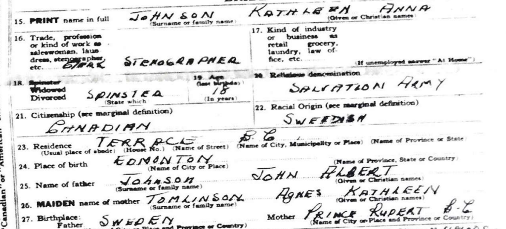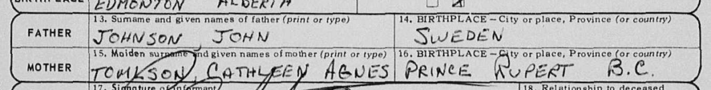 - Births (CR) Canada. Edmonton, Alberta. 14 December 1938. JOHNSON, Kathleen Anna. Certificate AB02295545. ↩︎