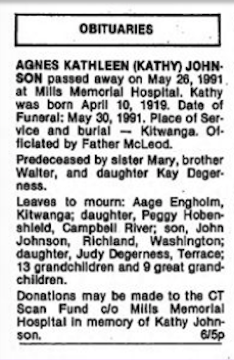 - Death announcements. (1991) Terrace Review. 05 June. JOHNSON, Agnes Kathleen (Kathy). p A13 c 1. https://arcabc.ca/islandora/object/terrace%3A54855#page/10/mode/2up : accessed 18 August 2021. ↩︎