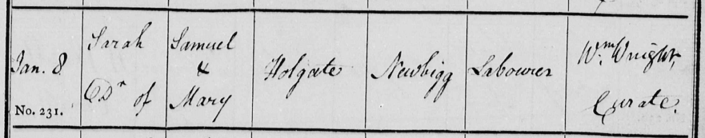 [1] Baptisms (PR) England. Haxey, Lincolnshire. 08 January 1817. HOLGATE Sarah. Lincolnshire Baptisms. p 29. http://www.findmypast.co.uk : accessed 31 December 2018.